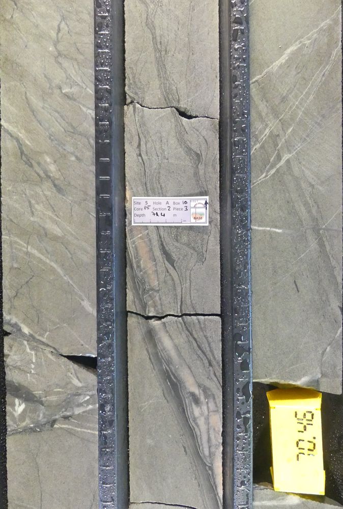 The rig at Site 5 is drilling through a large slump or rotated slide block with bedding about 90° to what was expected.
