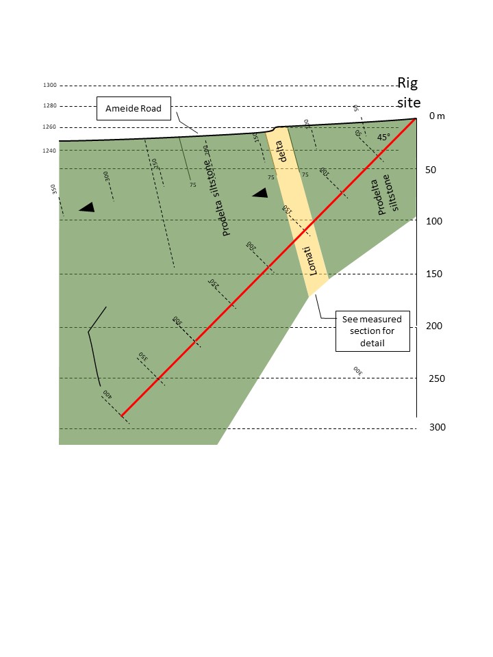 Newcomers to this project sometimes need to get used to our drilling geometry. Because the strata are overturned, we usually drill stratigraphically upward (but topographically usually downwards). Oldest strata are drilled first; the further we drill, the younger they get!