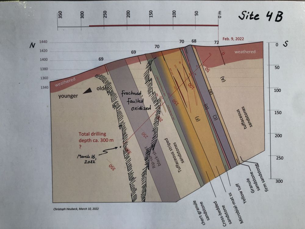 4B has drilled through >100 m of largely oxidized tuffaceous sandstones.