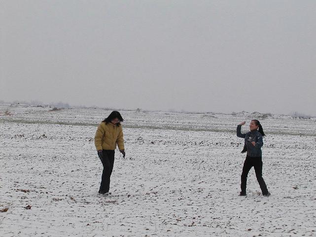 It snowed today, young people went out to have a snowball fight. Working is going on smoothly.