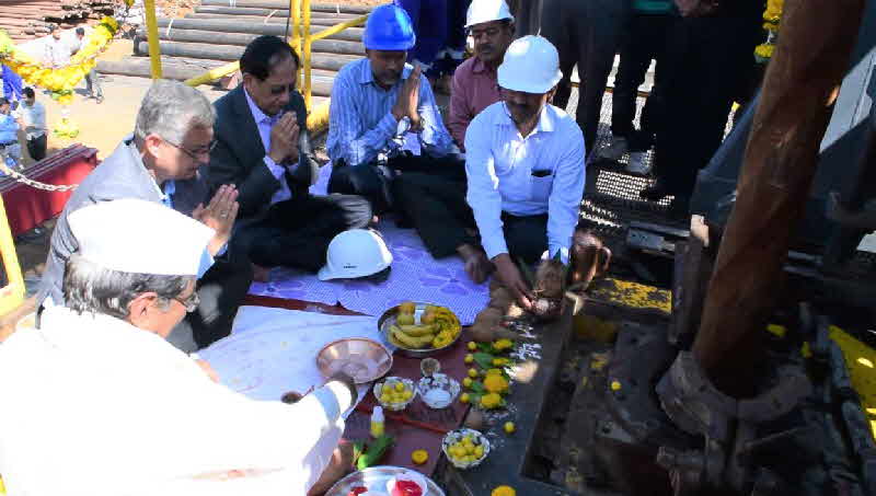 The wait is over! Borehole KFD-1 has been spudded at Koyna. Targeted to reach 3000 m depth in the next four months, drilling started with a 24inch Polycrystalline Diamond Compact (PDC) cutting bit and reached a depth of 14.88 m (w.r.t. Kelly Bushing) before lowering the 20inch diameter false conductor casing and cement grouting to isolate the overburden. During the next few days, the discharge line for cuttings will be connected to the conductor casing and the Mathena air-gas separator, arrangements for collection of cuttings will be set up, the mud logging unit and the ETP unit will be set up and synchronised with the rig. Calibration of different equipments will be carried out.