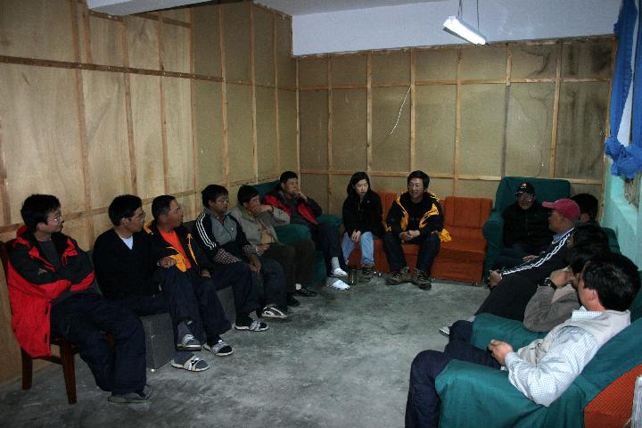 The weather is quite bad. The strong wind and waves stop the crew from moving the barge to SITE 1. A meeting is held to discuss how to deal with the emergency ocassion on lake.