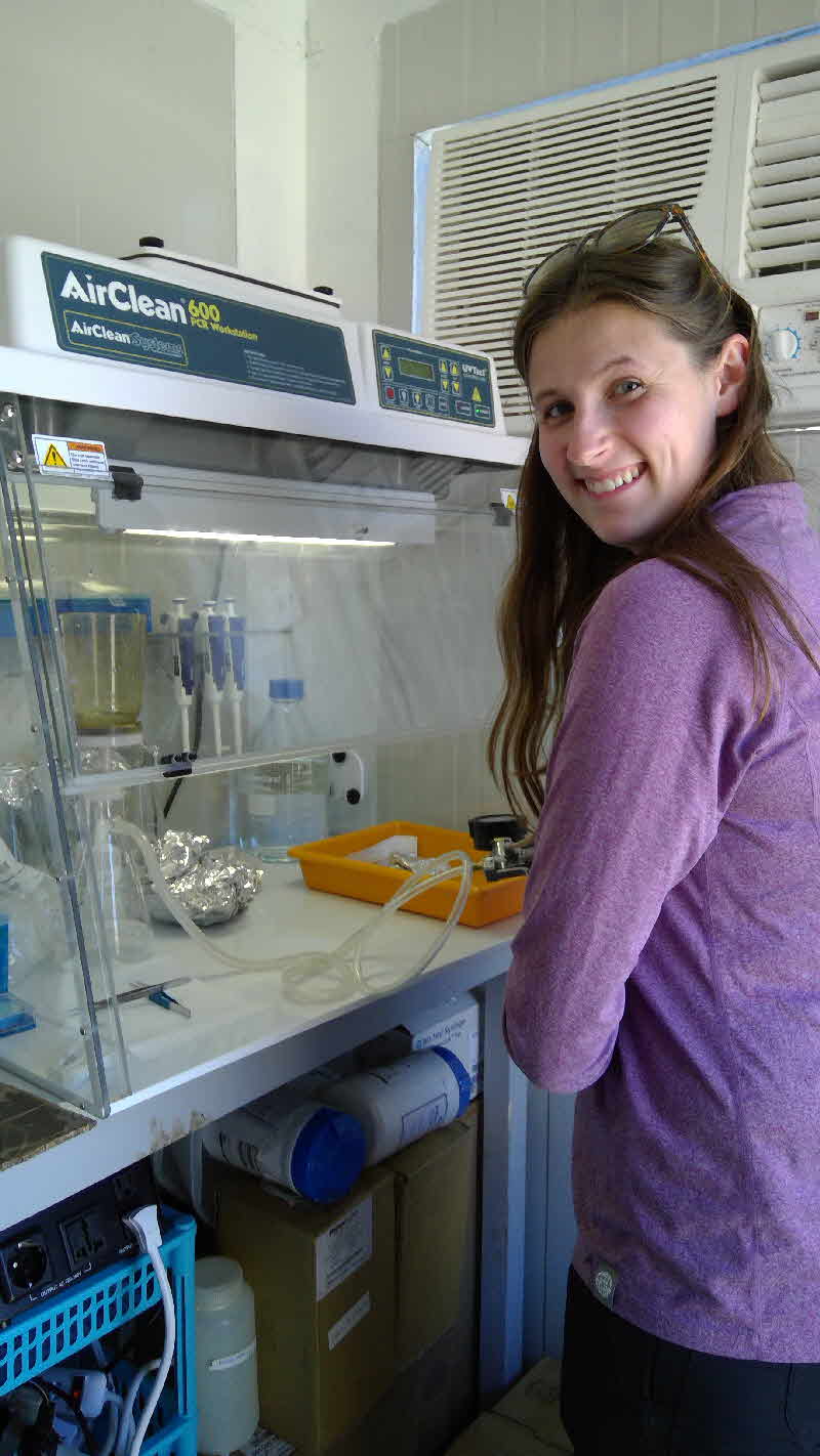 Katie working in the tight but well organized biolab portacabin at site BA3.
