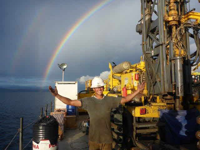 Today we have to say goodbye to a a fine young driller, Skyler Davis, who is off to Salt Lake City to get married. Skyler, it's been a true pleasure having you here and you will be sorely missed. From all of us here at TDP, congratulations and we wish a long and joyous marriage. The project is beginning to wind down. We had another fight anchoring the barge yesterday; had to drop two anchors near the drill site and ride out the night. Now all four anchors are down and we're getting ready to core our final hole or two. Should be drilling by the evening at the latest. (TDP on facebook)