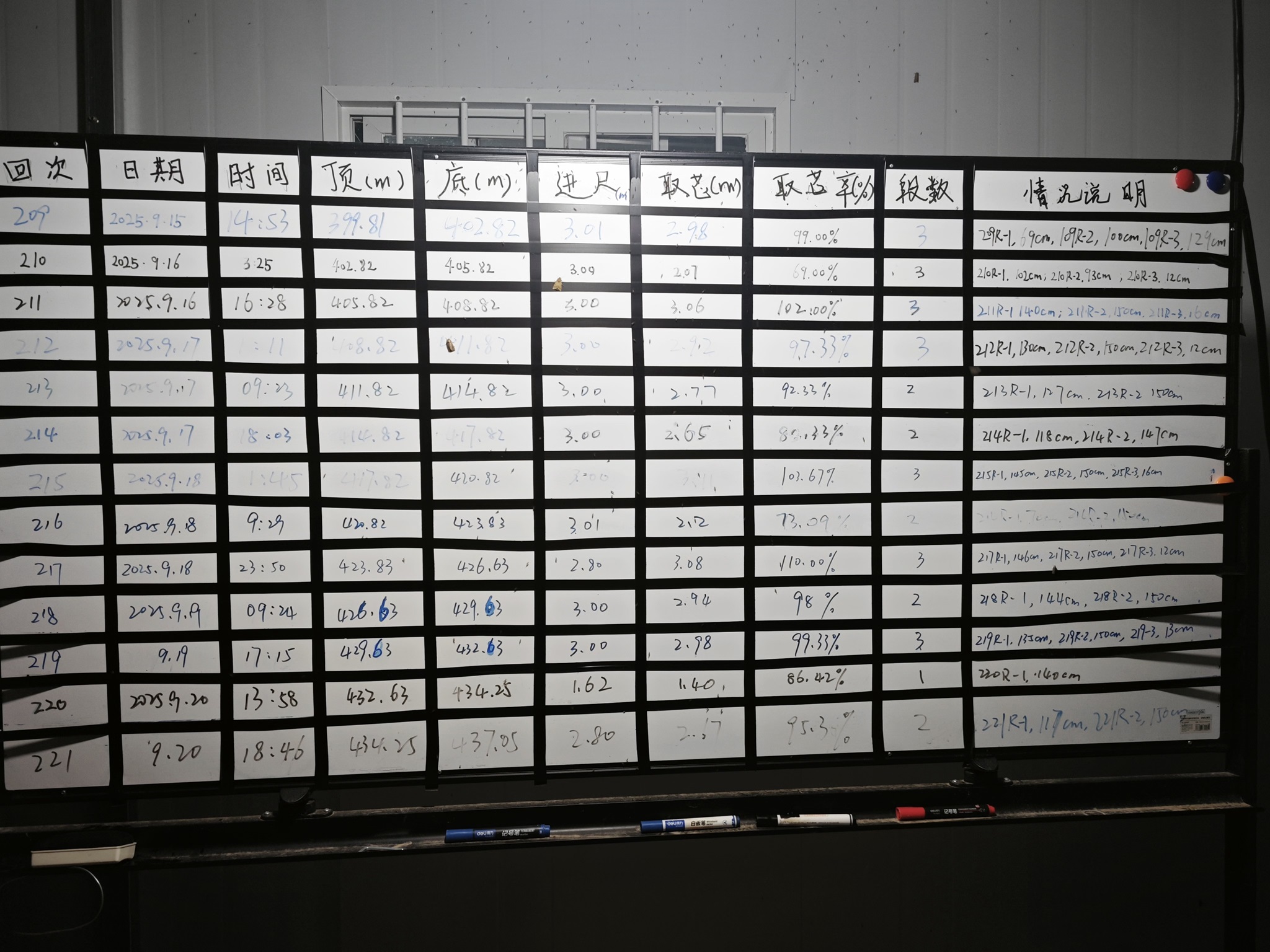 White board information from core run 209 to 221.