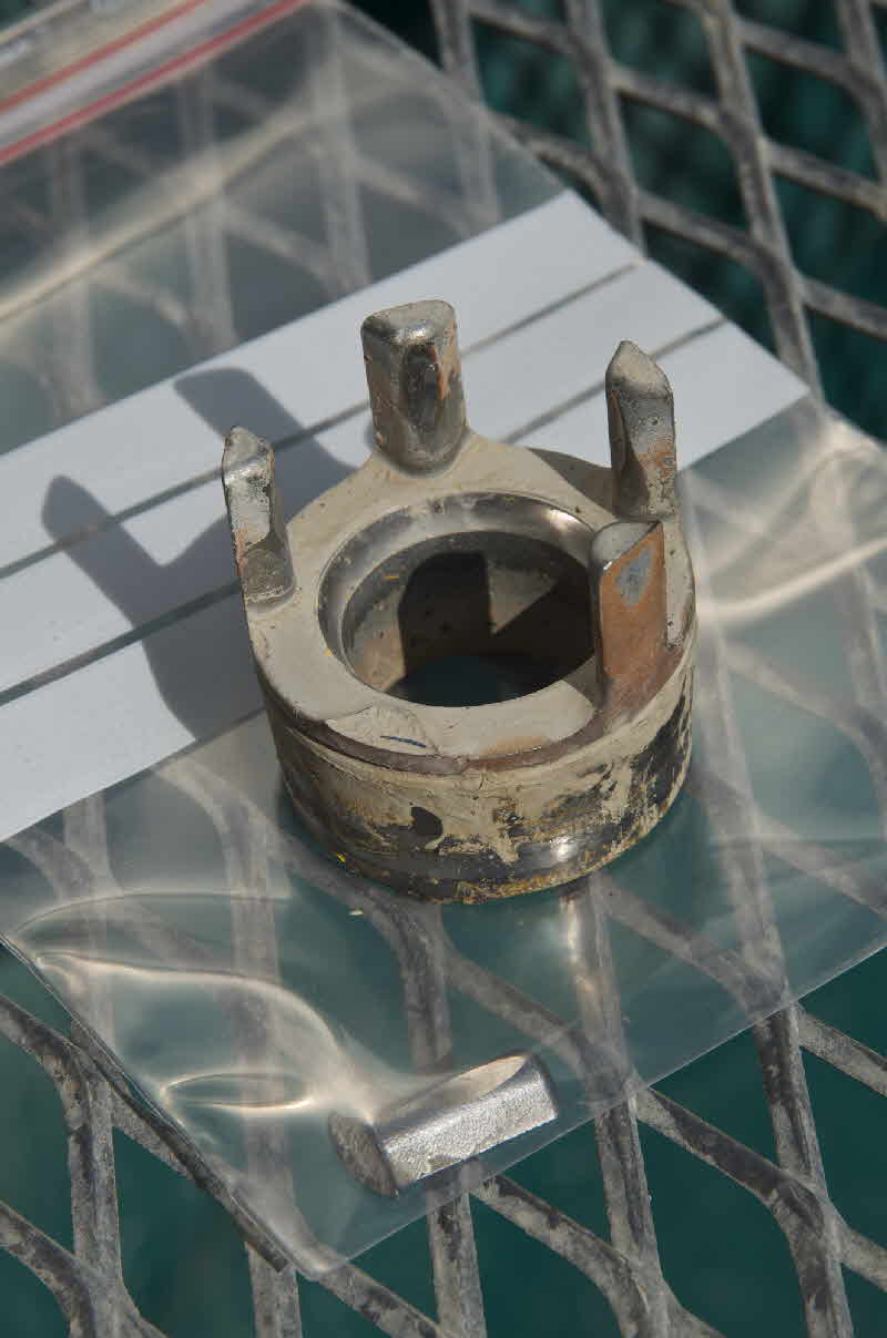 Presently, the hole depth is 1954 m. Two days ago, the drill bit was changed after 180 m, and everybody was very happy. The crooked drill string (the same problem as with the HQ drill string - bad quality) causes high friction and the drill bit can only be rotated with about a third to half of the design-rpm. But unfortunately, it didn't go that well this time. After only 24 m of drilling, the core barrel got stuck in the downhole assembly. After several fruitless attempts to retrieve the core barrel with the wireline, the drill string was tripped out yesterday and today. This time it will take longer than usual, because the (hopefulle straight) new drill pipe that arrived at the drill site recently will be installed instead of the crooked one that we use now - which implies breaking the -old- drill string into 3 m pieces and assembling the new one from 3 m pieces (instead of stands of 3 pipes=9 m during a normal round trip). Today in the morning the core barrel was retrieved, and it was jammed in the drill string by parts of the mud pump (see photos).