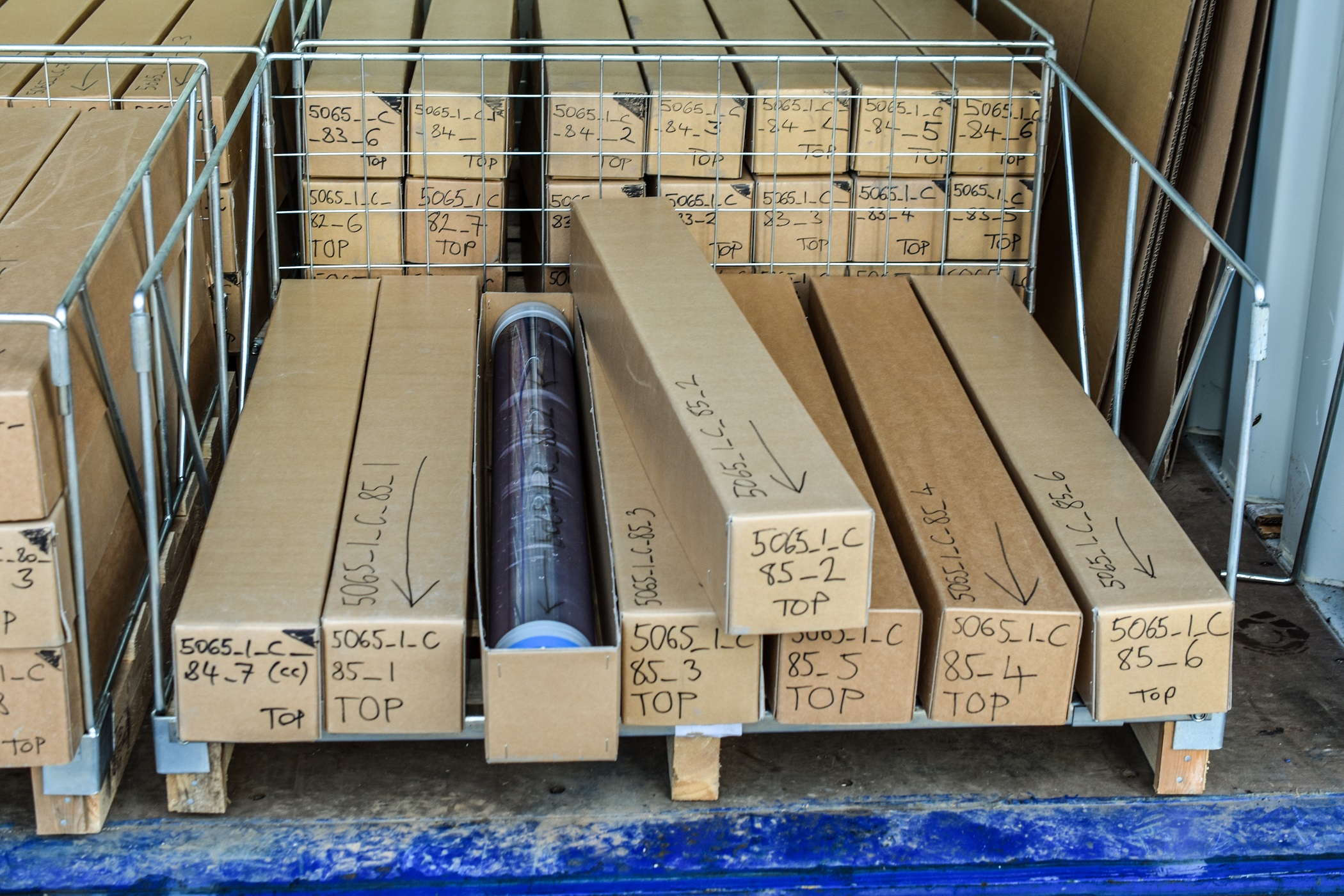 Curated cores stacking up in the core container waiting to be transported to the National Core Repository at the British Geological Survey in Nottingham. Each1-metre-long core section is carefully marked to show the order and the right way up using a variety of different signs (a “belt-and-braces” approach). Photo credit: Domi Szucs.