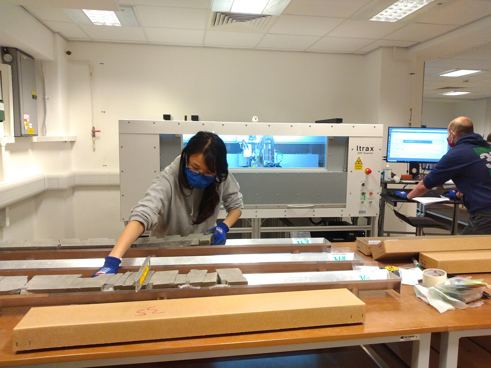 Jet scientists preparing for geochemical and geophysical scanning of core from Prees using archive material from the Llanbedr (Mochras Farm) drill core in Wales. Thanks to the help of the Core Scanning Facility (CSF) team, effective workflow procedures and scanning parameters were established. The aim is to start scanning Prees core next week.