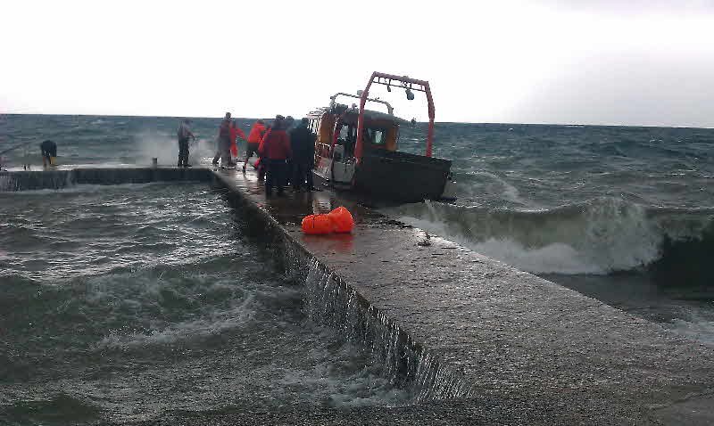 After another day (25.05) of waiting for calmer weather, we experienced one of the worst day here. Engine problems at the HBI boat, high winds and waves caused that the boat smashed for 1-2 hours on the dock in front of the hotel. Everybody was helping to keep the boat from the dock as good as possible. The dock got distinctly damaged, the boat also had some damage, but at the end of the day, nobody was injured, the boat (and also the shuttle boat) was still floating. A tourist boat managed to tow the HBI boat into the hangar of the institute. A long and hard day for everybody.