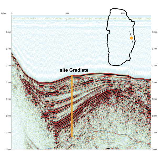 The nightshift hit into shallow water facies and gravel at around 82 m sediment depth. Due to a technical problem, the hole had to be given up and a new hole was started at the Gradiste site. Over the day, the Gradiste site was duplicated.