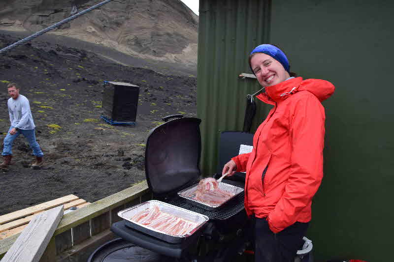 Barbara Kleine, our postdoc in fluid geochemistry, helps out with a critical component of dinner -- bacon -- as our DES drilling supervisor, Beau Marshall, walks by.