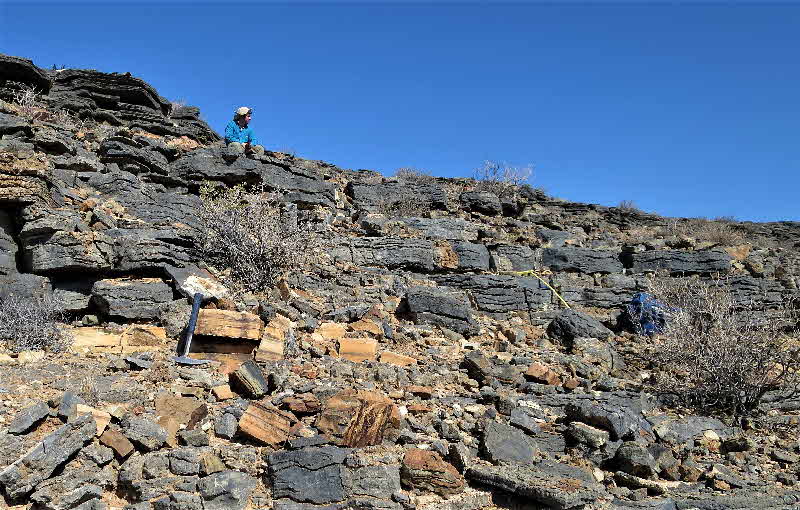 Today we took a field trip to the hills south of Swartpunt to collect ash beds and measure a stratigraphic section. We found Namacalathus in amongst the thrombolites just below this ash (see next picture).