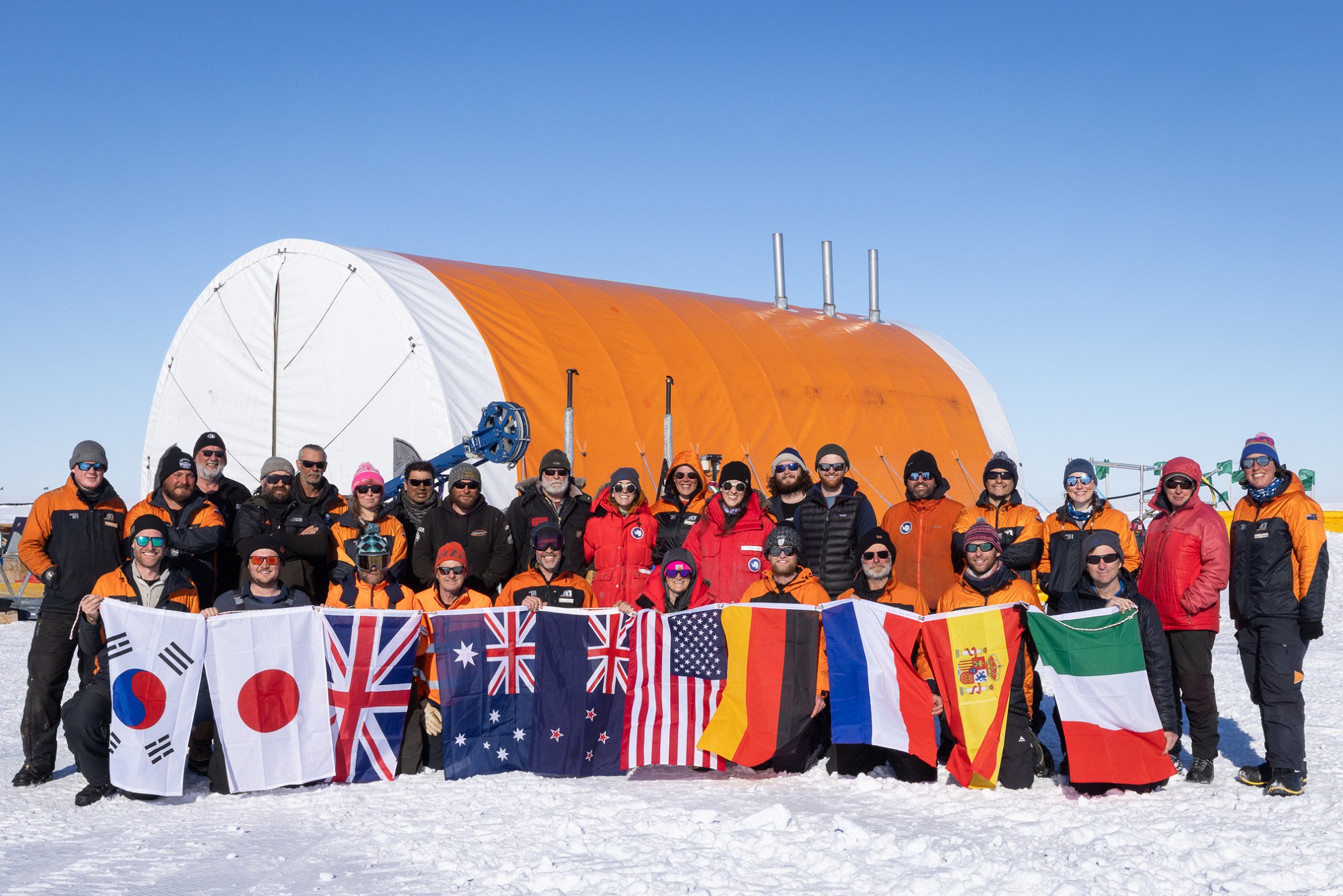We’ve wrapped up drilling at Crary Ice Rise (site: ICDP SWAIS2C 5072_2) with a whopping 228 m of sediment core, exceeding our target of 200 m! This is an unprecedented record of the history of the West Antarctic Ice Sheet stretching back millions of years, which will help the world forecast and prepare for future sea-level rise. Initial observations indicate the core includes periods where there has been environmental change in this area during past times of warming. Obtaining the core was a huge team effort, both on and off the ice. First, the traverse team towed our drill rig and other supplies 1100 km across the Ross Ice Shelf, and set up our deep-field camp. The rest of our team then flew in to get drilling and science operations underway. After assembling the drill tent and equipment, the hot water drill team made water from snow, and used this hot water to melt a hole through 523 m of ice. The Antarctic Intermediate Depth Drill team lowered more than 1300m of riser and drill string pipe down the hole, then rotary cored, pulling up core in sections up to 3m long. Our science team were on hand to describe, image, sample, and carefully process and package the precious core, for further analysis back in New Zealand and labs around the world. When coring was complete, downhole logging was carried out to provide further information about the sediment below the ice. The big pack-down is now underway, while our geophysics team are still working around the ice rise.