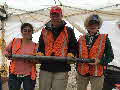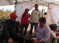 Coring continues. Peter Fawcett, Antje Schwalb and Carmen Acosta process a core fresh from the ground. The "300 m Club." Carmen (UNAM), Peter (Univ of New Mexico) and Antje (Braunschweig Technical Univ) show off the core section that put the project 300 m into the hole. (MexiDrill on facebook)
