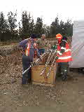 The heavy downhole logging equipment being loaded into a big truck, ready to go to the drilling site [post by Margarita Caballero] First night shift was rockin' and rollin'! Got 31 cores and ended right around 110 meters, where the 2008 cores bottomed out - so we're now collecting NEW SCIENCE! Whoo hoo! The second night shift is in progress! We had a little excitement wondering whether a volcano was erupting in our neighborhood, but it's just nopales (cactus) burning up on the slope. [post by Amy Myrbo]. With the help of the Marine and Limnology Sciences Institute, the downhole logging equipment arrived at the drill site. (MexiDrill on facebook)