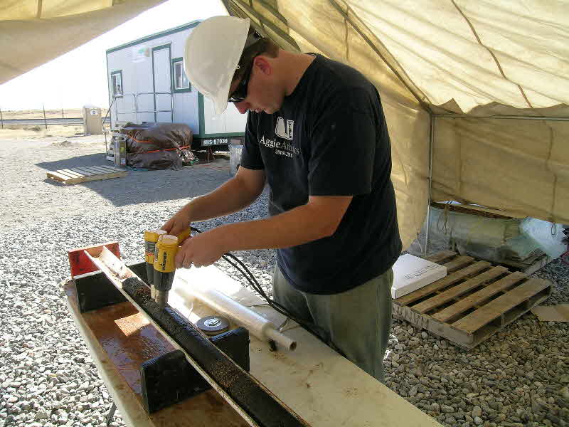 Spent Monday 10-04-10 trying to free the drill string. Monday afternoon decided to drill ahead with NQ rod to find bottom of aquifer. Monday night-Tuesday morning spent milling out HQ bit and clearing hole below stuck section. Started making NQ core mid-afternoon Tuesday. Continued to make core all night; now at 997 ft - 304 m and doing one more run before wireling logging begins. USGS crew from Idaho National Laboratory (Brian Twinings, Mary Hodges, and Linda Davis) arrived Tuesday afternoon with 2 USGS logging vans. Will log through NQ string Wednesday (gamma, neutrong, gyro) and see about open hole logging. Water samples will also begin by Roy Bartholomay of USGS. UPDATE: We made 200 ft of NQ core overnight till morning, for a total depth of 1007 ft. USGS has started wireline logging. USGS will take water samples at specific horizons.