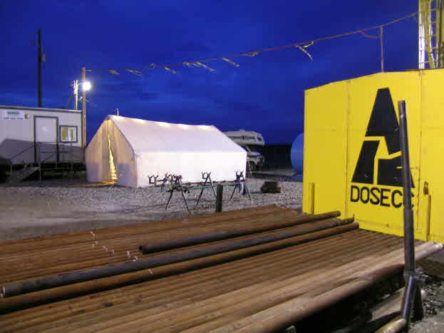Wireline drum broke on Tuesday so not much drilling completed -- drum repaired but new drum is being shipped up from SLC. Core continues to be very dense from low temperature alteration. Vesicles and pockets are filled with celadonite (blue-green clay/mica), which also heals fractures and apparently replaces former interstitial glass, giving core a bluish tinge. As a result core retrieved in long chunks -- see photo for 2.4 m piece that came up with temperature probe. We are now at 1127.8 m. BHT at 1120.4 m is 34.2 C -- putting us on a gradient of ~155C/km below the aquifer. At this gradient we should hit 100C around our planned depth of 1.5 km. Weather conditions -- cold and cloudy, but not as windy as Monday-Tuesday, when they had to stake tent down with extra guy lines. More weather on its way.