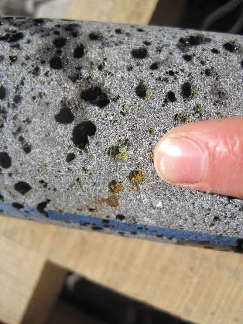 This Saturday (23 October) we successfully set casing to 274.3 meters, advancing HWT size casing with a casing shoe bit so that we would not have to pull the casing to remove the bit. Casing was landed in the center of a massive basalt flow (as determined by wireline logs and core photos). After cementing in place, we had to let cement cure for 24 hours before advancing again. On Sunday afternoon 24 October, the drillers cleared cement from casing and drilled through the cement plugs and down into basalt, officially beginning Stage 3 of operations - coring down below the casing string. We are continuing to core with HQ size rod. On Tuesday 26 October, we passed 274.3 m depth, thus advancing core to depths we have not sampled before. From here on down we are in new terrain. As of Wednesday night at midnight, we have advanced core to 431.9 m below surface. Have we finally passed through the aquifer? Are we finished with boring alteration mineral assemblages? Core from a depth of about 358.1 to 365.7 m, contains abundant zeolites and/or altered clay. These are most commonly green to yellowish brown, with the green zeolites/clay? often exhibiting a tabular form and the yellowish zeolites/clay? Appearing more massive. Core pulled below 365.7 m appears to be relatively unaltered and flow units still contain the usual calcite amygdules.