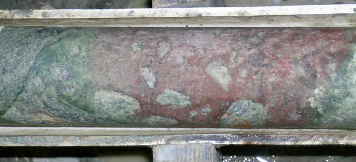 Tues March 01, 2011 at 19:46. We are at a depth of 617.9 meters. Core has varied from nasty mudstone and clays that have bound up the bit. We have cored quite a bit of what we called ash that has been altered. Our last run had a section of rhyolite that ranged in colors from red to to green. The wire line on the rig is messed up and made a big rat's nest.