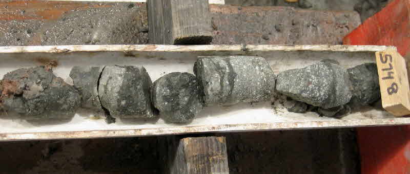 Quality, not quantity, summed up drilling operations today. Despite short runs, it appears that we may be getting out of the nasty clay/mudstone (knock on wood) and into more interesting material. The last runs, pulled this afternoon and this morning, are of well-cemented, grain-to-clast supported pebble conglomerate. Bedding appears to be present in the uppermost foot of the run, at about 5748.5', but with increased depth, clasts become more densely spaced and bedding is not apparent. Clasts are predominantly sub-angular and are mainly (85%) lithic fragments of white to pinkish felsic-looking material. There also appears to be some fine-grained red lithic fragments as well (chert?), but these make up <5% of the rock.