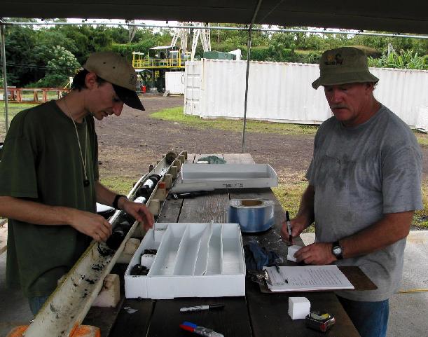 Today's drilling produced some different rocks than yesterday. Instead of just pillow lavas, we recovered pillow lavas and pillow breccias. Both of these unit types are massive, monolithologic, and highly fractured. The rock appears to be quite brittle, as many of the fractures show no evidence of alteration. They were probably induced during drilling at depth or removal of rock from the core barrel at the surface. Hopefully the core bit will reach more coherent rock soon. At the time of this report, 6:30 PM HST, we are drilling at a depth of 10,284 feet.