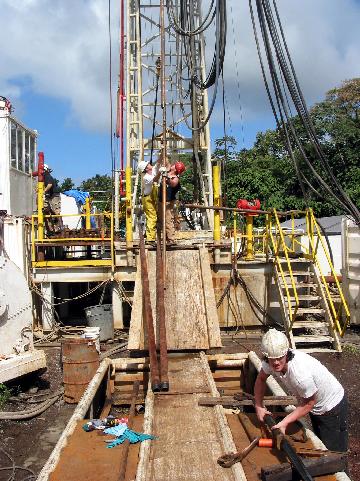 Progress has been slow due to the highly fractured nature of the rock we are trying to drill through and some equipment problems. We recovered another run of core today, after fixing the diesel engine's alternator. Our current issue is that core fragments have fallen out of the bottom of the core barrel as it was brought to the surface. We have to use a spear tool to clear out the drill string before the next core barrel will be able to rest behind the bit at the bottom of the hole. Coring should resume again this evening.