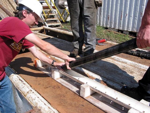 Three full runs of hyaloclastite were waiting for us when the core processing crew arrived this morning, and another run was drilled during the day. We appear to have just penetrated a new unit, so we look forward to seeing the rock that the next run holds. Our current depth is 11,308.2'.