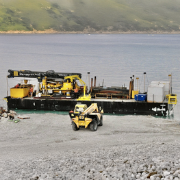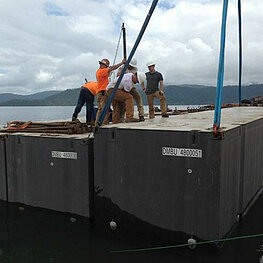 ICDP owns a modular barge (Damen Modular Pontoon 2407) consisting of six 40-ft container-size elements that can be tightly clamped together once in waters. The dimensions and capacity of this drilling barge are: length 24.3 m, beam 7.3 m, deck space 180 m2, deck loading 6.8 t/m2, draught 0.4 m (empty). It was formerly used for the icdp DLDS - deep lake drilling system. Assembly and operation of the barge requires for experienced personnel, preferrably a drilling crew familiar with lake drilling operations.